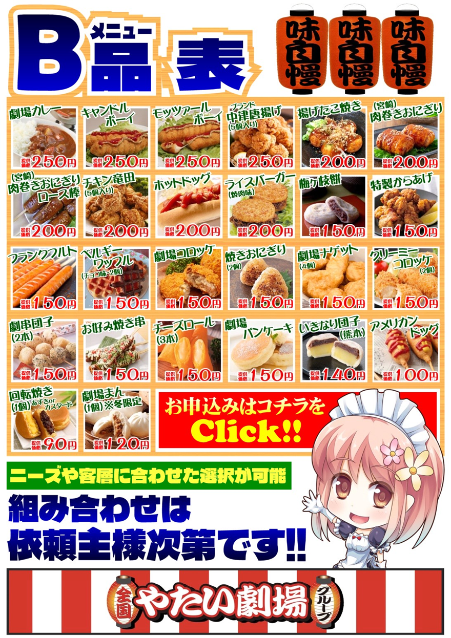 | 商品は、お客様が飽きないように新商品を企画開発して提供していきます。 販売価格が安い為、地域の活性化や町を元気にするプロジェクトとしてもアピールできます! 安くておいしい食べ物は、必ず人から人への口コミで広まり、 一人でも多く御社様のお店への話題性に結びつくように盛り上げてまいります。 |